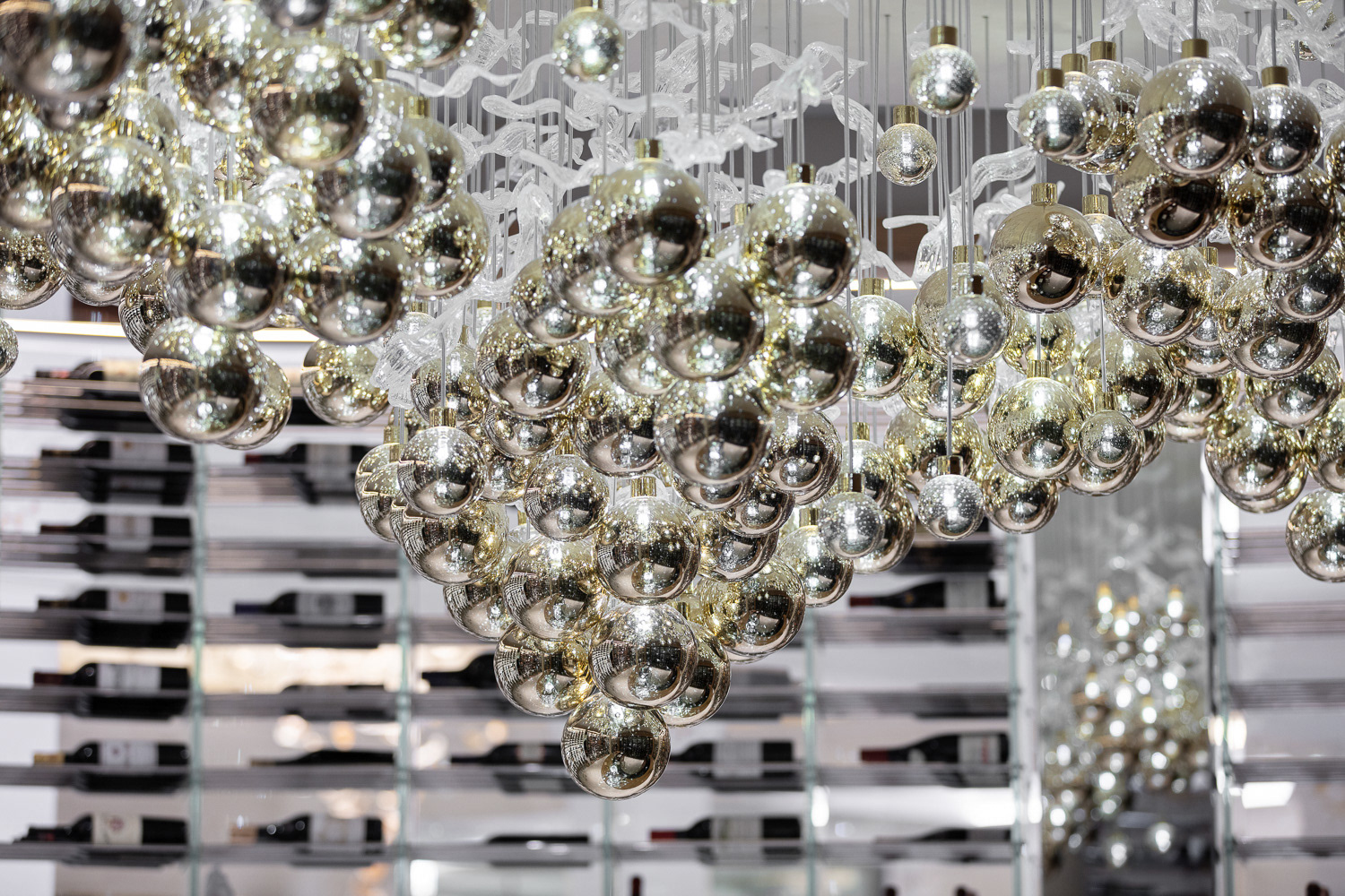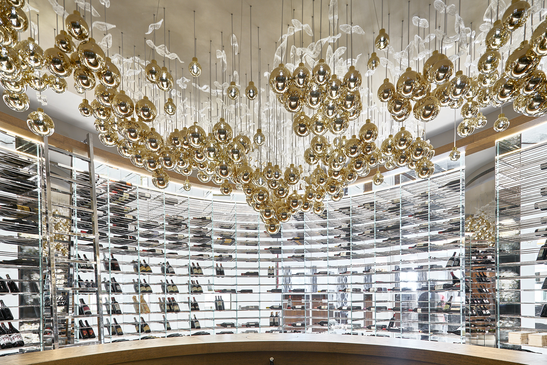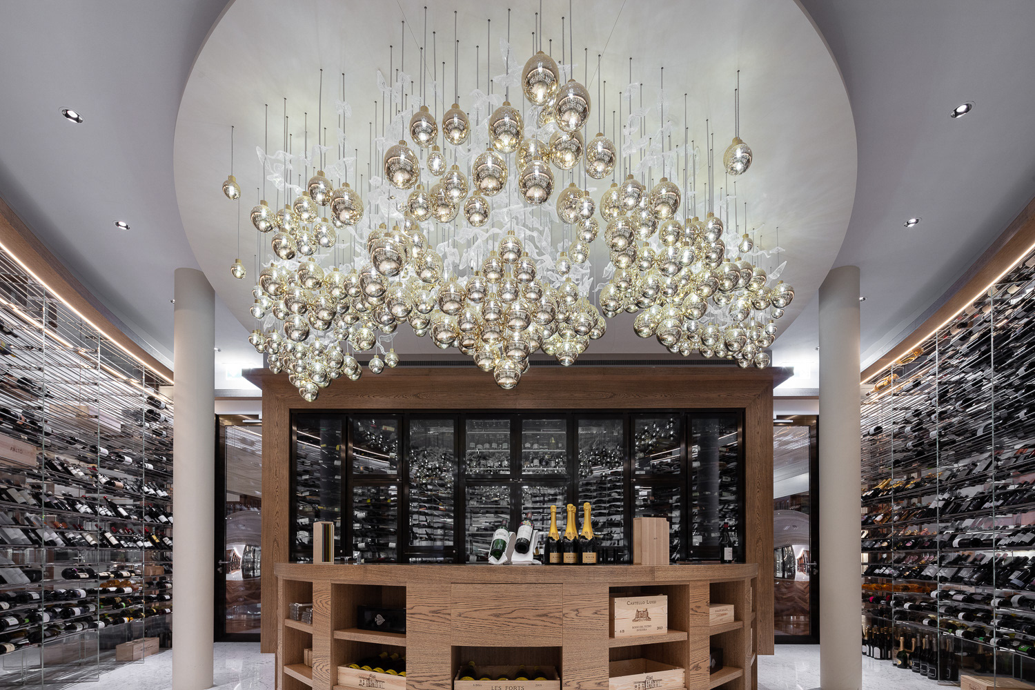 Bespoke chandelier designed to the specific area of the vine Bar in five star hotel Grand Resort Bad Ragaz in Switzerland. It has dynamic lightning reacting to the clinking by the vine glasses.